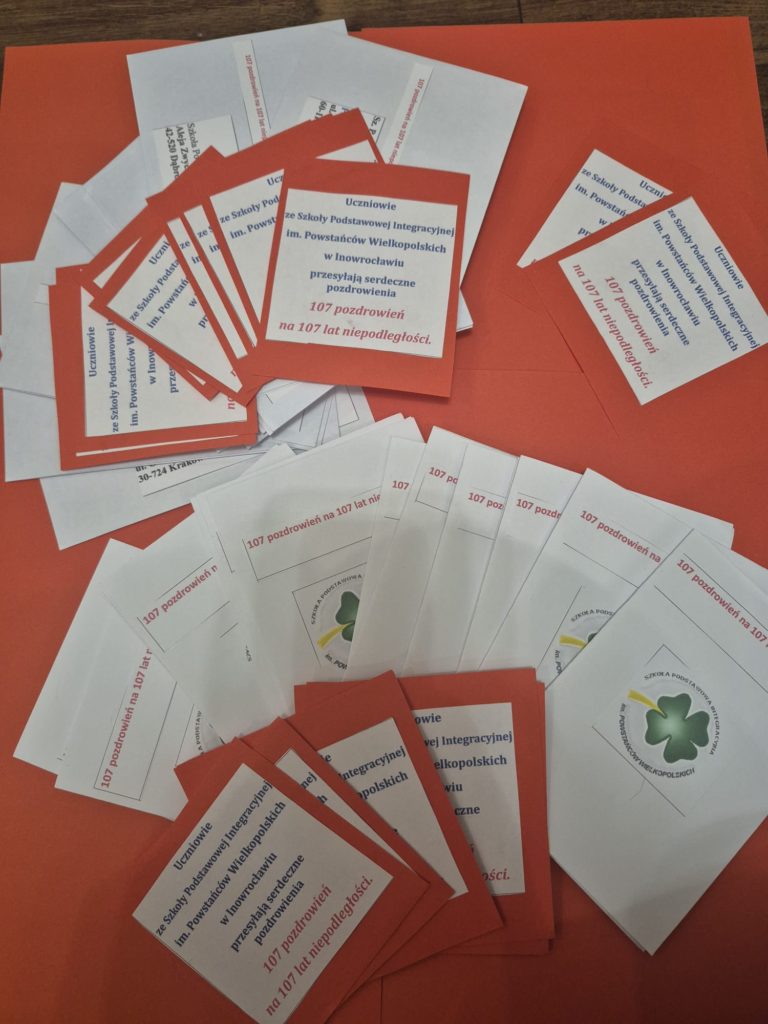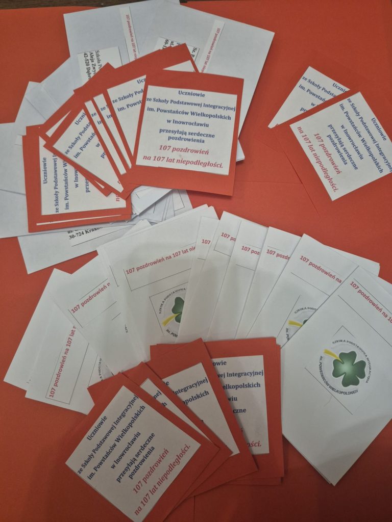 ŚWIĘTUJEMY 107. ROCZNICĘ ODZYSKANIA NIEPODLEGŁOŚCI PRZEZ POLSKĘ! 107 POZDROWIEŃ NA 107. ROCZNICĘ ODZYSKANIA NIEPODLEGŁOŚCI. Uczniowie z Samorządu Uczniowskiego (z klasy 7a: Szymon, Jan, z klasy 7b: Lena, Lena, Lena, Antonina, Zuzanna, Milena, Wiktoria) wraz z p. Magdaleną Szczepaniak, opiekunem S.U. we współpracy z uczniami z klasy 6 b oraz klasy 7 b wzięli udział w 3. edycji wymiany pocztówkowej z okazji Narodowego Święta Niepodległości. Uczniowie przygotowali kartki, które licznie wysłaliśmy do szkół w naszym kraju. Jest to akcja ogólnopolska. Nasza szkoła również otrzymała ze szkół, z całej Polski liczne pocztówki i kartki z pozdrowieniami świętującymi: 107. ROCZNICĘ ODZYSKANIA NIEPODLEGŁOŚCI PRZEZ POLSKĘ!